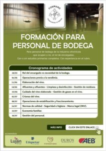 La formación está destinada a personal de bodega de la industria vitivinícola que ocupen o no el rol de encargados, tengan o no estudios primarios completos, con o sin experiencia en el rubro. Consta de 10 encuentros consecutivos a partir del 28 de mayo del 2025 y hasta el 30 de julio inclusive desde las 9.00 hs hasta las 14.00 hs. La propuesta incluye el desayuno.